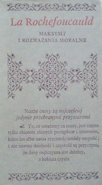 „Nasze cnoty są najczęściej jedynie przebranymi przywarami”, oto motto jakie La Rochefoucauld daje swemu zbiorkowi i istotnie wyraża ono dobrze myśl autora. Głęboki pesymizm, niewiara w naturę ludzką, wieją z tej książeczki. Egoizm, miłość własna, lęk lub pragnienie korzyści, oto składniki, które znajduje, ilekroć rozbierze z osłonek jakąkolwiek czynność ludzką: oto co zostaje, gdy ją rozdziać z mniej lub więcej świetnych pozorów. Z zadziwiającą przenikliwością i sztuką, z piekielnym iście upodobaniem, ściga autor nasze pobudki aż do najtajniejszych zaułków duszy; zarazem, zatapiając i obracając ten sztylet w sercu ludzkim, dba o to, aby jego rękojeść była najpiękniej rzeźbiona, aby forma każdego aforyzmu była najbardziej misterna, iżby tym okrutniej występowała na jaw ironia treści. (fragment Od tłumacza).