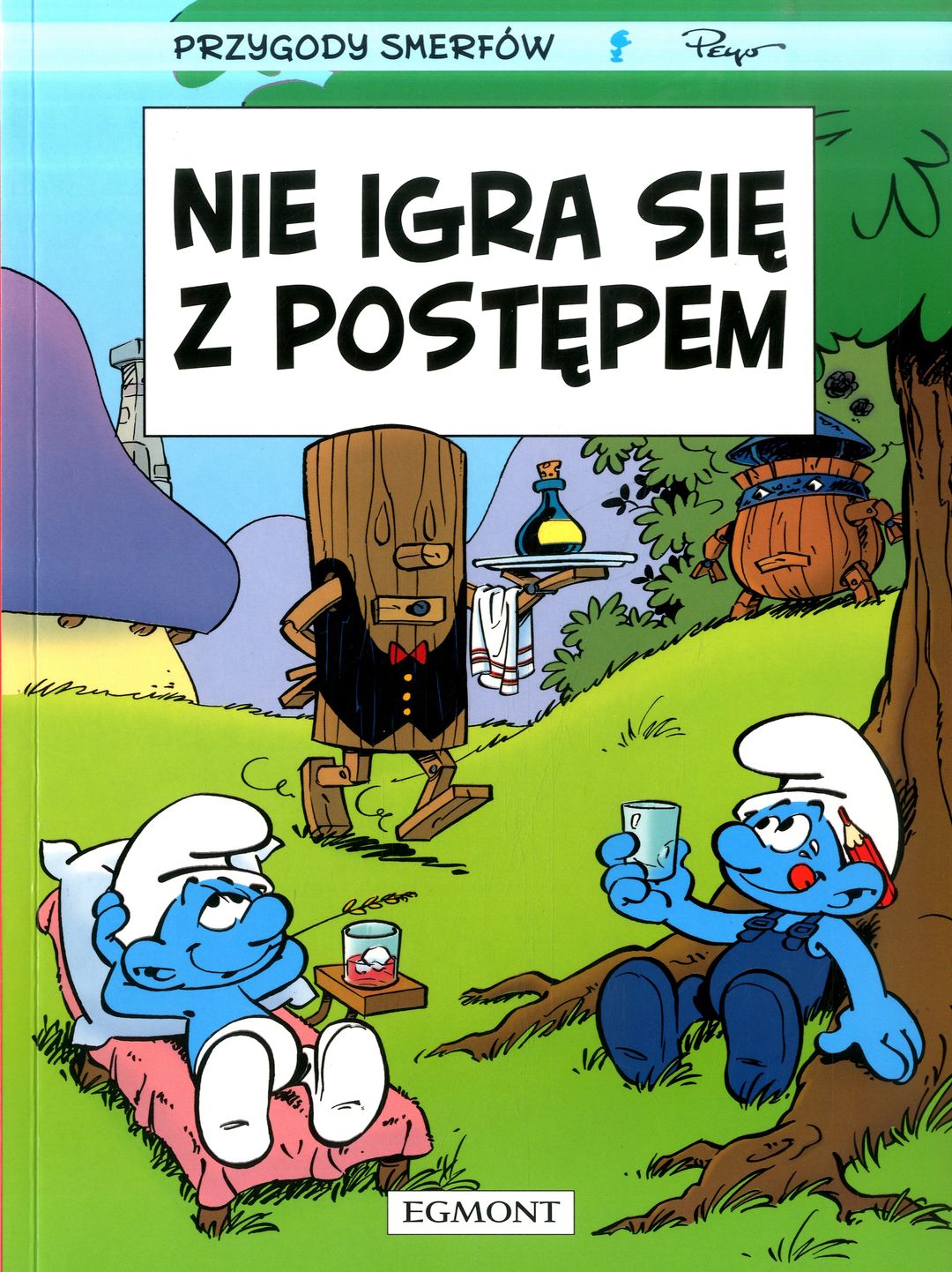Papa Smerf wyruszył w kolejną podróż, a to oznacza jedno: pozostałe Smerfy zaczynają harcować. Zaczyna się od Śpiocha, który zamawia u Pracusia wynalazek, który pozwoliłby mu pomagać innym, ale bez wysiłku. Pracuś spełnia życzenie kolegi, a wtedy ustawia się do niego kolejka innych Smerfów chętnych do usprawnienia swojej pracy nowymi urządzeniami. Tak oto w wiosce Smerfów rodzi się POSTĘP. Ale ułatwianie życia ma także minusy, a niebieskie skrzaty wkrótce się przekonają, że Nie igra się z postępem. Czy Papa Smerf zdąży je ocalić przed skutkami nadmiernego dążenia do wygody i nowoczesności?