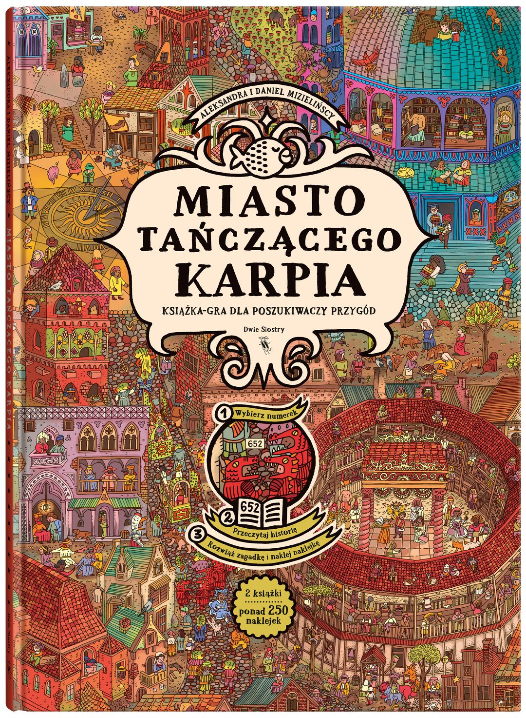 Miasto Tańczącego Karpia : książka-gra dla poszukiwaczy przygód / Aleksandra i Daniel Mizielińscy. - Wydanie I. - Warszawa : Wydawnictwo Dwie Siostry, 2024. - [52] strony, [7] kart tablic ; 35 cm + dodatek: Podróżnik (152 strony : ilustracje ; 24 cm).