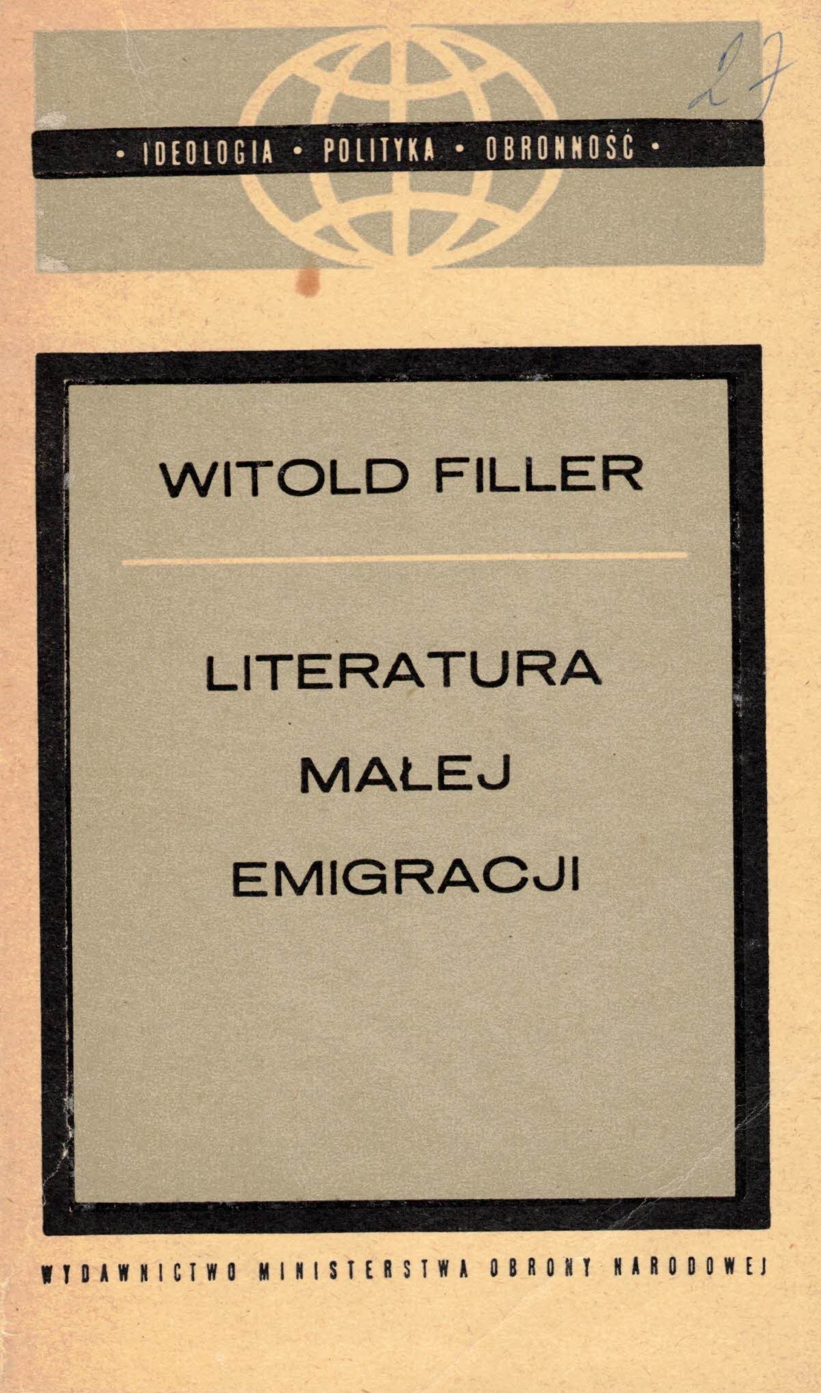 Literatura małej emigracji / Witold Filler. - Wydanie I. - Warszawa : Wydawnictwo Ministerstwa Obrony Narodowej, 1970. - 105, [3] strony ; 18 cm.